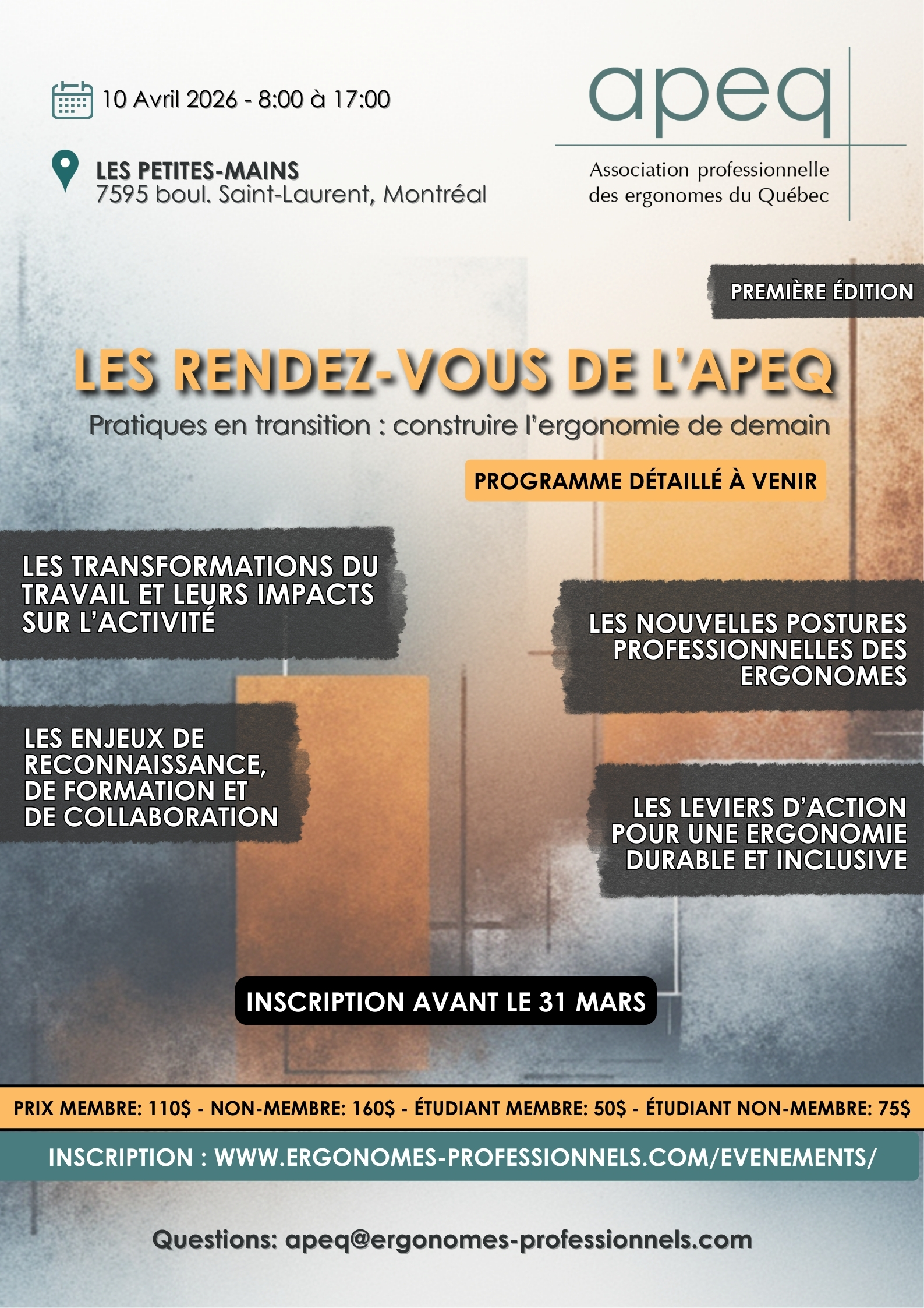 L’Association professionnelle des ergonomes du Québec (APEQ) est fière de lancer son tout premier Rendez-vous, une journée entièrement consacrée aux réflexions, échanges et inspirations autour de l’évolution de notre pratique.